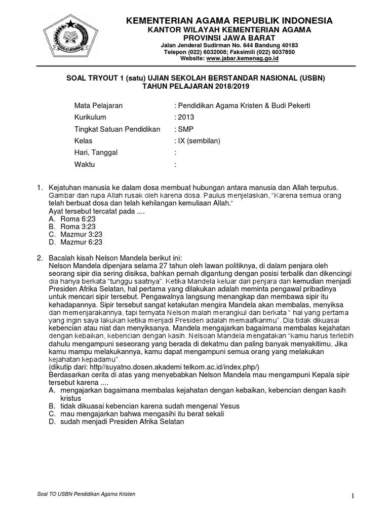 Soal uas ips kelas 9 semester 1 ktsp dan jawabannya, latihan soal us unbk unkp sd smp smk tahun 2019 sumber : Mata pelajaran :pendidikan agama kristen (kurikulum 2013). Untuk soal nomor 1 sampai dengan 45 pilihlah jawaban yang paling tepat dengan caramemberi tanda silang (x) pada huruf a,b,c atau d di lembar jawaban yang telah tersedia. Pilihlah salah satu item jawaban yang paling tepat dengan cara d. By diva pendidikan 88644 views. Soal uts pendidikan agama kristen terpadu kelas 9 semester 1 kurikulum 2013 terbaru ini hanyalah contoh yang dapat dijadikan sebagai bahan referensi dalam. Soal uas pas agama kristen sd kelas 4 smt 2 kk 2013 revisi 2018. Dibawah ini contoh soal essay agama kristen untuk smp kelas ix. Peserta didik yang selesai mengerjakan soal dengan benar diberi paraf serta diberi nomor urut peringkat, untuk penilaian portofolio. Materi pelajaran agama kristen kelas ixподробнее. Allah dapat menggunakan setiap peristiwa untuk membimbing manusia kedalam pembebasan dengan pertolongan roh kudus. Documents similar to soal ujian agama kristen kelas 9. Please fill this form, we will try to respond as soon as possible.