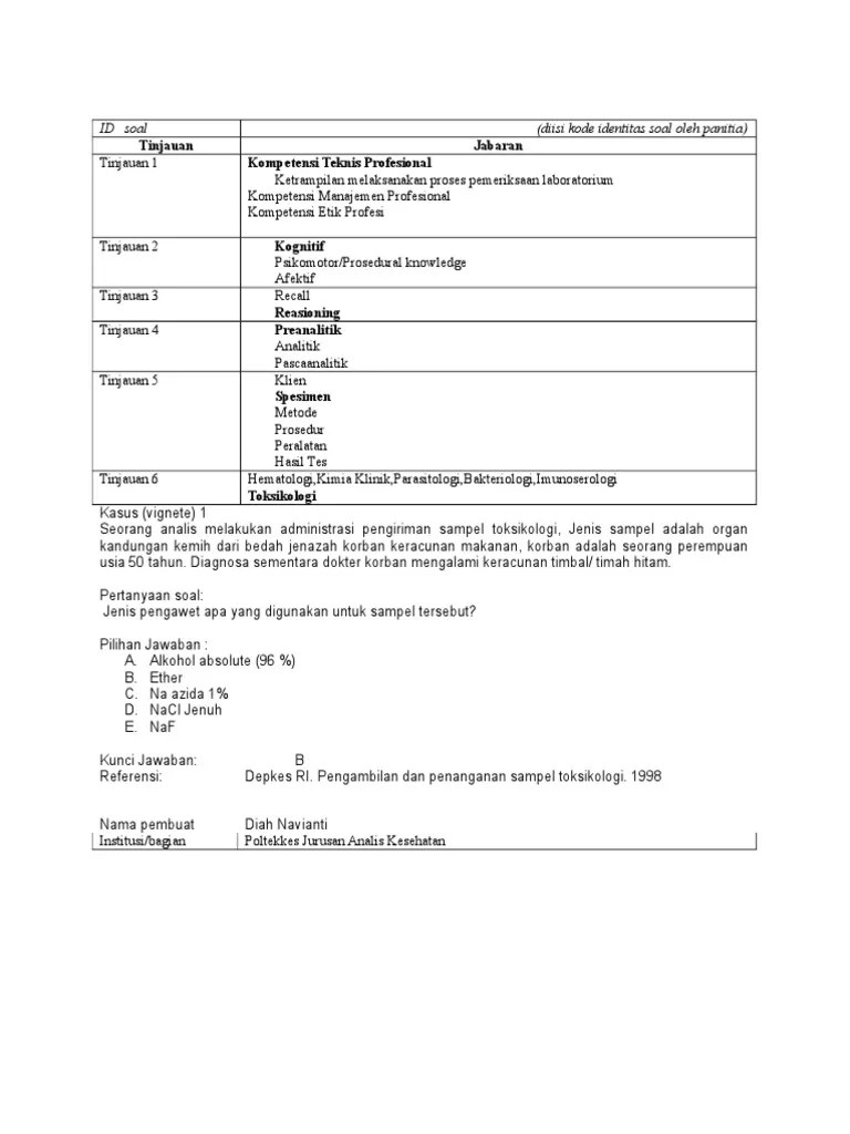 Soal Tes Kerja Analis Kesehatan / Soal Tes Masuk Kerja Analis Kesehatan Jawabanku Id - Pada sesi pertama narasumber memaparkan tujuan dan kisi kisi penyusunan soal uji kompetensi dengan blue print terbaru.