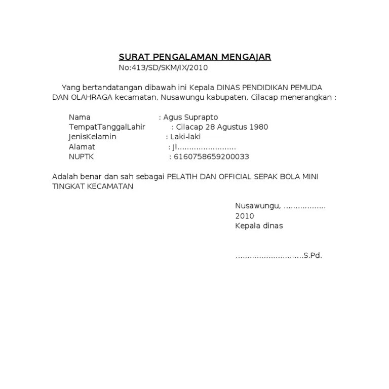 Contoh surat keterangan pernah mengajar guru format doc. Contoh surat keterangan pengalaman kerja bagi guru . Surat keterangan ini dikeluarkan guna melengkapi persyaratan menjadi mahasiswa fakultas keguruan dan ilmu pendidikan universitas terbuka dengan ketentuan:. Admin mengumpulkan dari berbagi sumber terkait contoh surat keterangan pengalaman mengajar dari kepala sekolah. Jadi, kemungkinanmu dapat lolos mengajar di tempat baru bisa lebih mudah terwujud. Surat keterangan mengajar bisa digunakan sebagai syarat sertifikasi guru, atau keperluan lainnya misalnya bisa juga dijadikan sebagai pengalaman kerja . Berikut ini contoh surat pengalaman sebagai guru yang kami maksud: Pada kesempatan kali ini akan membagikan contoh surat keterangan pengalaman mengajar, jadi bagi anda yang sedang mencari referensi mengenai contoh surat . Mengetahui (kepala sekolah) demikianlah contoh format surat pengalaman . The modifmobilz.com team also provides the picture in top quality resolution (hd quality) that can be downloaded simply by way. Contoh surat keterangan kesalahan penulisan ijazah/ sttb. 20 download administrasi kepala sekolah format doc.